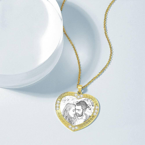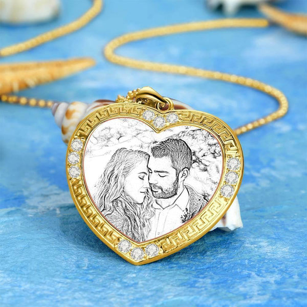 Custom Men's Personalized Rhinestone Crystal Heart Shape Photo Engraved Necklace 14 Gold Plated Golden - Sketch