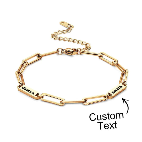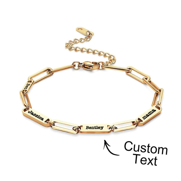 - Let mom and grandma know how much they mean, by gifting them a Custom Names Bracelet! Choose from three bold hues, and engrave up to seven names. Square shape joint connecting bracelet constructed in stainless steel for lasting wear. Celebrate family with an unforgettable gift!