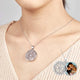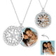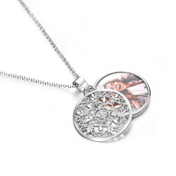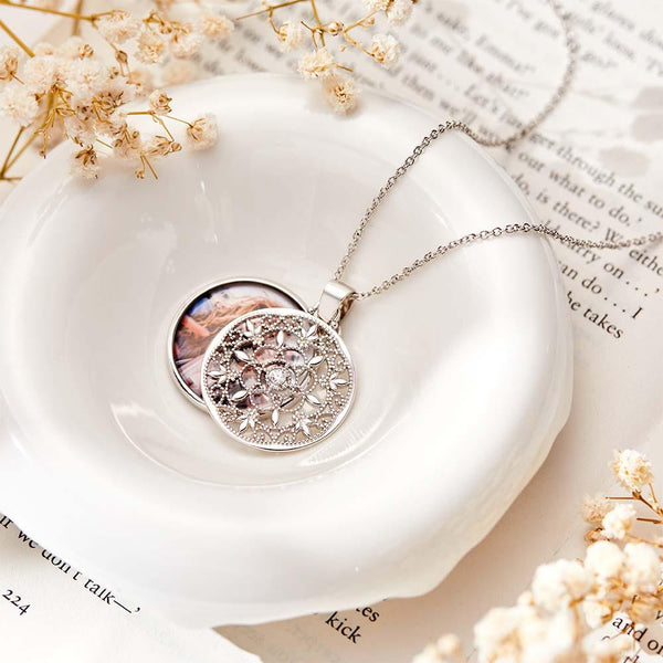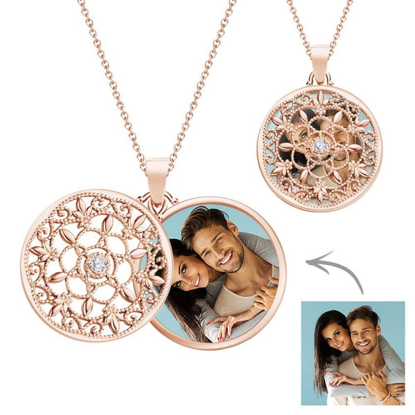 This beautifully ornate round locket is made up of two pieces, swiveling one in front of the other. The locket is secure in the back piece, which is clearly visible through the front floral design that is accented by a diamond that has been set in the center of the front round.
