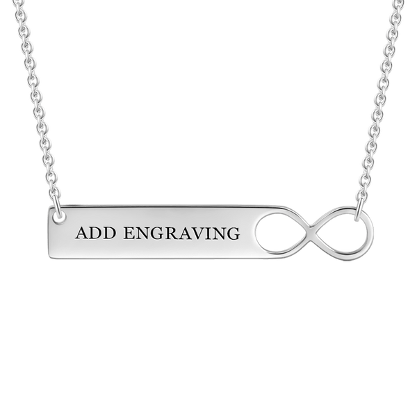 Whether you are looking for a gorgeous and versatile gift for yourself or one for a loved one in your life, the Engravable Infinity Bar Necklace would be a fantastic choice. This engravable necklace features a horizontal bar that has an infinity accent incorporated into one side of it. The infinity is a timeless symbol that is very meaningful. To personalize this necklace, the bar can be engraved with various words and numbers. Engravings to consider include anniversary dates, nicknames, a significant other's name, and so much more. Not only will it look fashionable, but it will have meaning behind it as well. This lovely necklace can be purchased in three different metals: .925 sterling silver, rose gold, and 14K yellow gold plated. Four Lengths: 15 in (37.5 cm), 15.8 in (40 cm), 16.5 in (42.5 cm) and 17.7 in (45 cm).