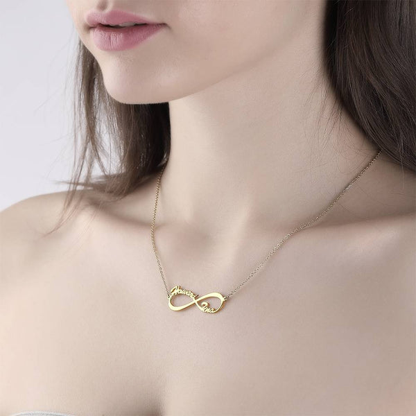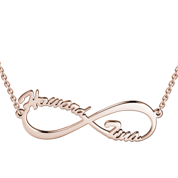 - As a sweet gift idea, BFFs or couples could get their names put on one infinity symbol. This infinity necklace is available for purchase in .925 sterling silver, rose gold, and 14K yellow gold plated.
