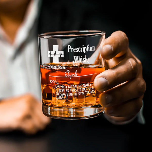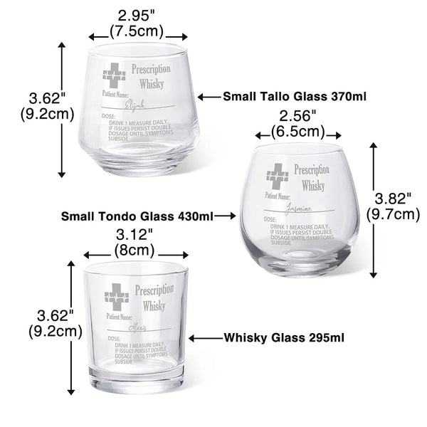 [CUSTOMIZABLE WHISKY GLASSES]: Choose from three distinct glass styles—Whiskey Glass, small tallo glass, or Small Tondo Glass—and personalize them with an engraved "Prescription" label and your recipient's name for a unique and humorous touch.