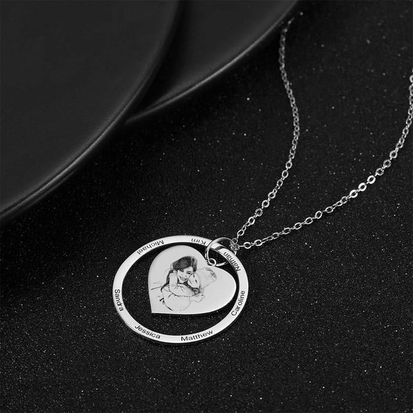 Photo Engraving is the most loved new trend as it allows you to memorialize your favorite photo into a piece of jewelry you can wear every day. This Photo Engraved Necklace is the perfect backdrop for your favorite photo . Add an extra level of personalization by placing an engraving on the back of this photo engraved pendant. The perfect thoughtful, fun, and unique gift for any occasion! yournamenecklace has a ton of customized jewelry options that are reasonably priced and make for great gifts for all sorts of occasions like birthdays, holidays, anniversaries. Photo Engraved Necklace Heart In Round Pendant, Family Necklace Platinum Plated - Silver.