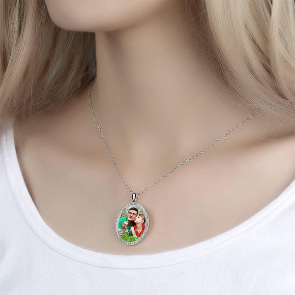 Women's Engraved Personalized Rhinestone Crystal Shield Shape Photo Necklace Platinum Plated Silver - Colorful