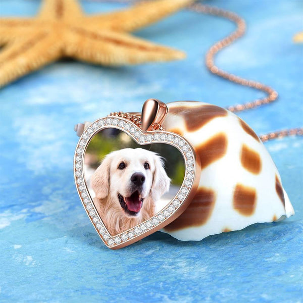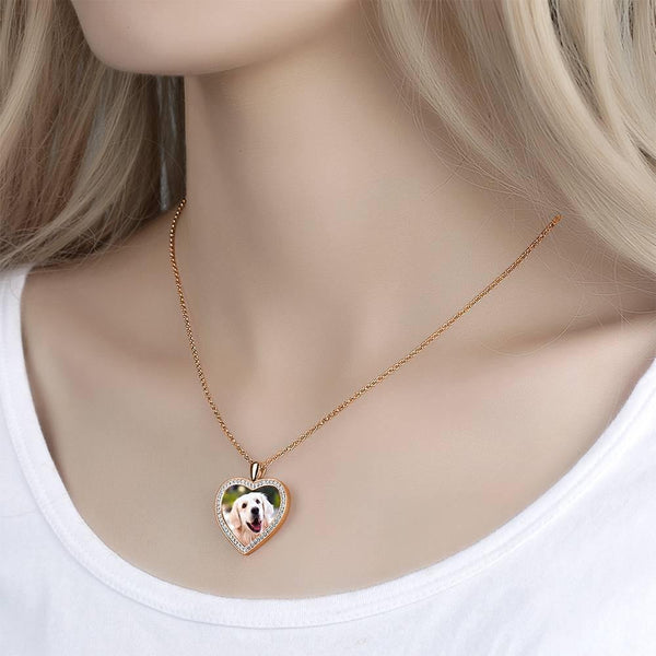 Women's Personalized Rhinestone Crystal Heart Shape Photo Engraved Necklace Rose Gold Plated - Colorful